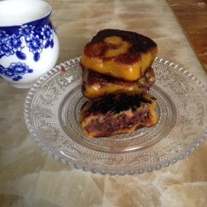 这是煎的,上面加了黑芝麻,我特地切了一块,有没有看见里面的红豆泥,满满的,很有食欲