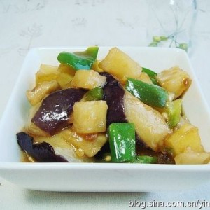 依次将土豆、茄子(皮嫩就不用削皮)削皮切成块,青椒去蒂去籽切成块。