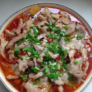油锅里放入生姜片大蒜桂皮八角炸出香味再倒入三勺郫县豆瓣酱和少许剁椒,继续翻炒加入料酒盐再加入水。等水开了滑入腌好的肉片用筷子划开放点味精关火装入备用的蔬菜碗里,撒上葱花。锅洗干净放点油热了淋在肉片上一道美味的水煮肉片就OK了!