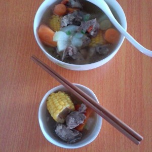 先放入排骨、玉米、胡萝卜、枸杞、花旗篸,加适量水小火在沙锅里煮至沸腾。