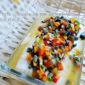 将彩椒、皮蛋丁,蒜泥放在盘子里,加入盐、米醋、白胡椒粉拌匀后倒在豆腐上即可