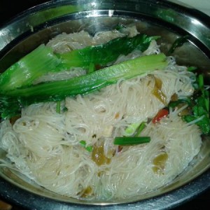 加入2碗水烧开后放入泡软的粉条煮一分钟。