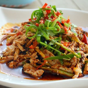 把调好的油辣子倒在鸡丝上面,加上香菜和葱装饰即可