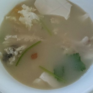 二、另一锅烧开水把鱼、枸杞、红枣放进去;大火煲十分钟;汤变成乳白色;三、把豆腐再放入汤里;再煮十分钟;最后放入胡椒粉、盐、香菜就可以出锅了!