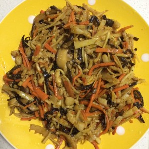 茭白,春笋,香菇泡好,木耳泡好,均切丝。醋、生抽、白糖、淀粉、香油,加水调好汁。