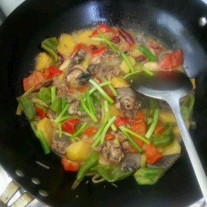 15分钟后开锅放入青红椒,盖上锅盖。继续小火慢炖十分钟后,加入葱。可以起锅啦!!!