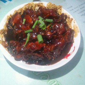 汁快没了,就勾芡淀粉在里面加入鸡精调料浇在排骨上面,然后收汁装盘【请忽略上面的装饰因为我不喜欢香菜。有芝麻可以撒点芝麻】