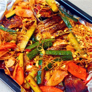 把炒的好豆芽黄瓜胡萝卜放到烤好的鱼上面。