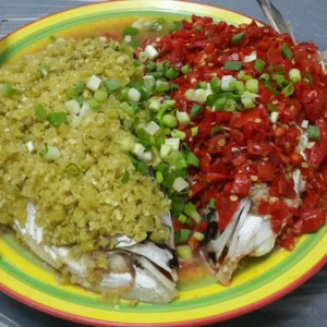 腌好的鱼头平放在盘子里,把剁椒盖在上面,根据鱼头大小上火蒸12-15分钟。