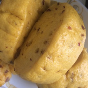 把南瓜泥放入面包机后,在上面依次加入高筋面粉,低筋面粉和酵母