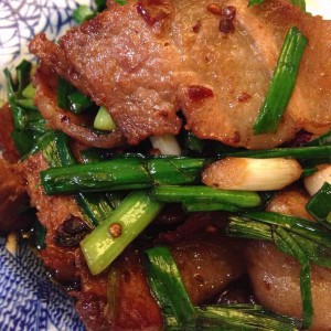 加辣椒酱两勺,微微翻炒,加入蒜苗后干后再加入一勺,继续翻炒,然后加入蒜苗叶。