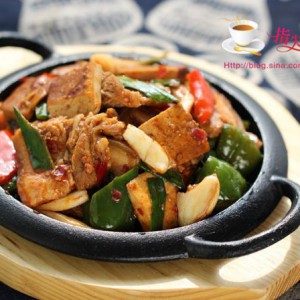 当豆瓣酱均匀的裹在五花肉上时, 再下入香干块;