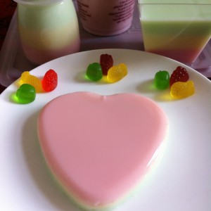 第五步:把黄色的QQ糖按照红色QQ糖的步骤做一遍,搅拌均匀了,然后倒入之前已经冰好凝固的红色糖浆模具中,然后再放入冰箱冷冻一会!