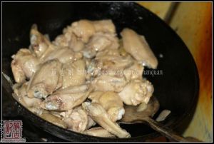 锅中放油,不用太多,放入姜片红葱头爆香,放入鸡翅煸至表面微黄