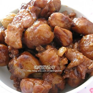 锅内放入少许油,稍热,放入鸡腿块,倒入老抽、白糖,翻炒上色,放入剥好皮的板栗,继续翻炒,至板栗变色,放入盐和少量水没过鸡块和板栗,盖上盖子,开大火烧开,倒入少量牛奶(放心奶哈~),转小火,烧30分钟。