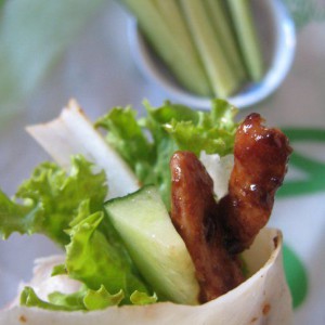 锅里留少许油,倒入料汁,熬制一会儿后,倒入滑好的肉丝,翻炒,加入少许水淀粉,继续翻炒使肉丝均匀挂满变稠的料汁,出锅,盛放在铺好生菜叶和葱丝的盘里即可。