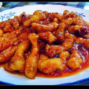 将刚才炸的金黄的里脊肉条全部到入锅中翻炒,直到酱汁与里脊肉条充分结合,然后捞出装盘即可