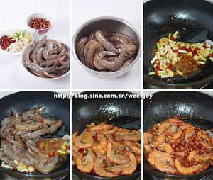 倒入大虾翻炒均匀,至变红时,加入花生米和剩余的蒜,根据口味再调入少许盐,翻炒均匀即可出锅。