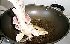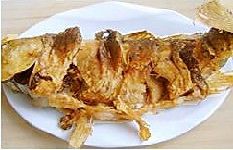 油烧至七成热,,提起鱼尾,先将鱼头入油稍炸,再舀油淋在鱼身上,待面糊凝固时再把鱼慢慢放入油锅内