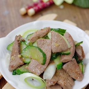 青瓜洗净、切成半圆薄片,姜蒜切末,大葱切片;