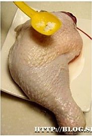取出鸡腿,周身刷一层蜂蜜。(刷蜂蜜是为了鸡腿烤制后色泽更好,在蜂蜜中滴入一些白醋,烤出来后的皮会有些脆脆的,口感更好,这是在网上看到的小秘笈)