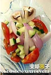 配的中式沙拉:蘑菇(焯水),洋葱(焯水),樱桃番茄,黄瓜,醮上沙拉酱拌均即可。