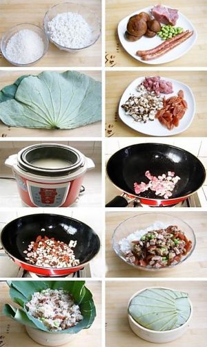 将米饭和所有的食材拌匀,再用荷叶包好,蒸约七分钟熟透便可。