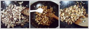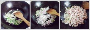 炒锅内倒油,先将葱姜蒜末放入爆香,再加入洋葱丁,炒至颜色变黄。