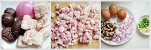 提前将干香菇泡发,准备好材料,五花肉洗净后切成大块放开水中焯去血沫。