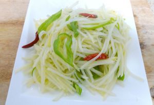 放入土豆丝、青椒翻炒,依次放入白醋、糖、盐、鸡精,在炒一分钟即可出锅。
