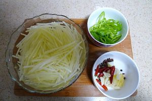 土豆削皮、切丝泡在清水里,反复冲洗,直到水变清。青椒切丝、蒜切片、葱姜切丝。
