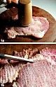 猪扒肉用松肉锤敲松两面,将旁边及近边有筋的地方剪断,以防煎时卷起。