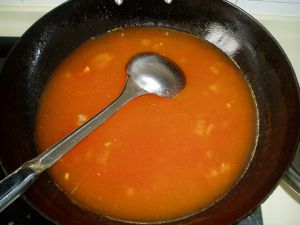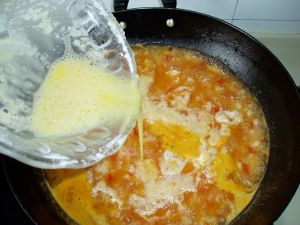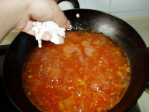 然后把面絮用手抖入西红柿汤中,边加边搅拌。