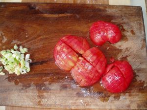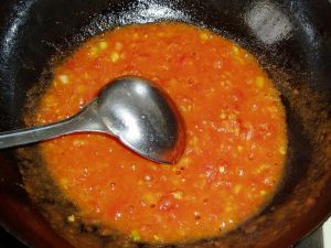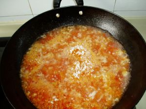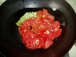 炒锅倒油爆香葱姜,倒入西红柿翻炒。