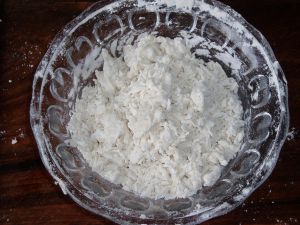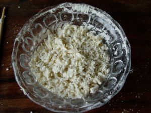 一点点的加入清水,用筷子慢慢搅拌成为面絮状。