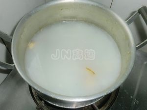 准备好用猪腿骨煮好的并已冷凉的圆骨汤。瞧这汤炖的多好,雪白的如牛奶一般。
