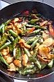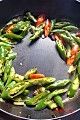 利用锅中的剩油,倒入青红美人椒,也要把它们炒的焦焦状,锅中没有一点水分