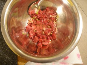 牛肉切成小块块,加少量盐,糖,酱油,蛋清以及葱末,搅拌一下,放在一边待用。