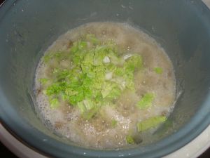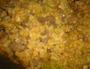 待米饭已煮至粘稠状时,倒入准备好的牛肉以及白菜(或者按个人喜好加上洋葱,胡萝卜)。搅拌均匀。盖上电饭煲盖子继续用煮饭档。因为我只做自己吃的量了,所以米饭看上去有点少。