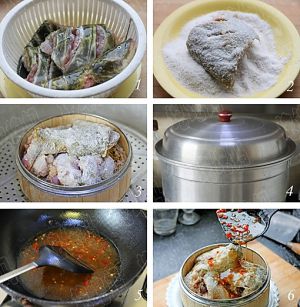白蒸菜粉铺于盘中,将腌好的鱼块两面拍上蒸菜粉;