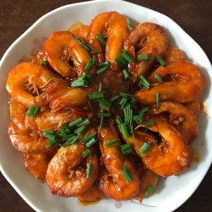 3.热油:放入花椒、姜、蒜、红辣椒、白糖翻炒、后放入虾翻炒、待虾变色、放入调好的酱汁继续翻炒、加入适量的盐、味精调味最后倒入少许开水,大火收汁。