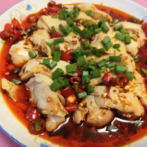调酱汁:蒜末、小米辣、盐、糖、酱油、醋、花椒油、鸡精、辣椒油、少许煮鸡的汤。淋上酱汁,洒上葱花即可。
