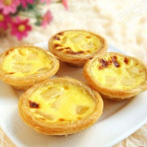 将蛋挞皮放烤盘里,将芦荟块放里面,一个挞皮里面放四—5块芦荟就可以了。过滤好的蛋挞水倒入放有紫薯块的挞皮中。