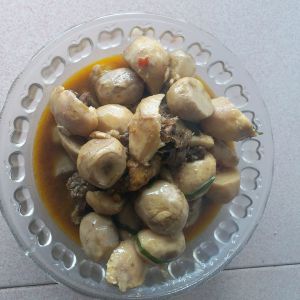 芋儿和鸡肉翻炒均匀,加入少许盐和生抽