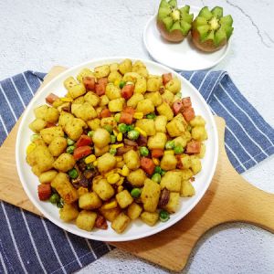 锅里放炒菜量的油,先放洋葱爆香,再放火腿丁或者肉丁,再放蔬菜丁,最后放馒头丁翻炒!