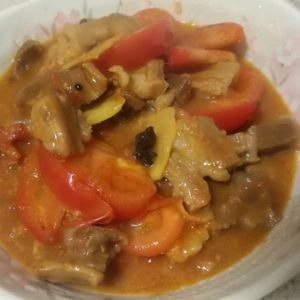 3、锅里,加一小勺油,炒切好的西红柿两个,将压好的牛腩倒入,闷煮15分钟,番茄就化成汁了,加盐加酱油,待水分粘稠,再加入一个切好的番茄一个,闷三分钟熟了起锅。最后一个西红柿绝对酸爽。
