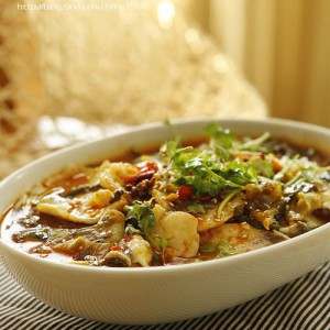 煮1分钟后待鱼肉煮成型不易散后,拿勺背轻推鱼片搅拌数下。