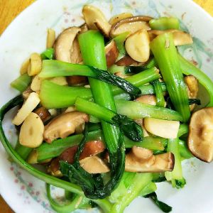 放入香菇和油菜,继续翻炒,加少许生抽或者味极鲜。