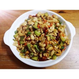 将胡萝卜,黄瓜丁下锅翻炒均匀后下入鸡丁,黄飞红花生米,再加入调好的碗汁,翻炒均匀。