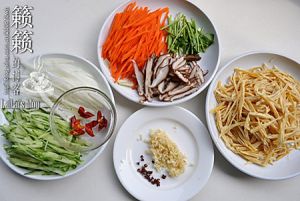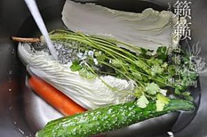 将菜蔬:胡萝卜、香菜、嫩黄瓜、大白菜用流动清水浸泡、洗净。黄瓜胡萝卜去皮后切条丝状;大白菜取菜帮子部位切成条丝状备用;香菜取香菜梗切段备用;